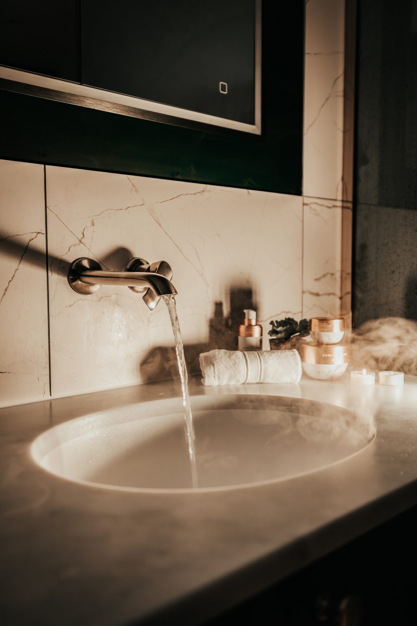 Then come the white matt porcelain tiles, which bring the whole scheme into sharp focus. With their subtle veining and soft texture, they are more than just a backdrop. They are the modern counterbalance to the bath’s traditional curves – minimal, tactile, and effortlessly fresh. The matt finish absorbs light rather than bouncing it, creating a calm, architectural feel that keeps the room serene despite its bold palette.
